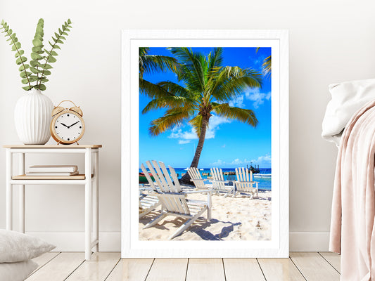 Palm Tree & Beach Chairs on Saona Island View Glass Framed Wall Art, Ready to Hang Quality Print