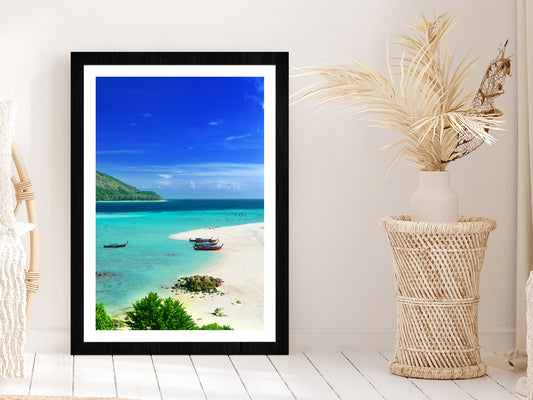 Boats near Lipe Island Blue Sky View Thailand Glass Framed Wall Art, Ready to Hang Quality Print
