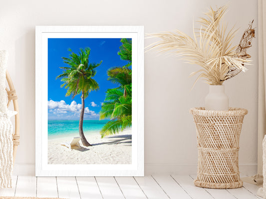 Palm Tree & Chair in Paradise Beach Photograph Glass Framed Wall Art, Ready to Hang Quality Print