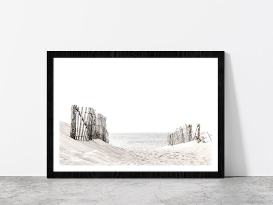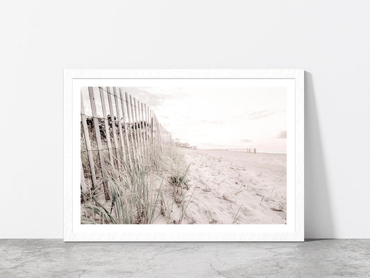 Beach Fence on Sandshore Faded Photograph Glass Framed Wall Art, Ready to Hang Quality Print