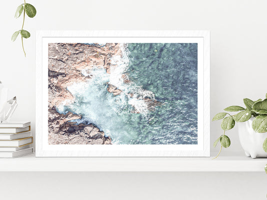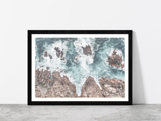 Seawaves over Rocks Aerial Photograph Glass Framed Wall Art, Ready to Hang Quality Print