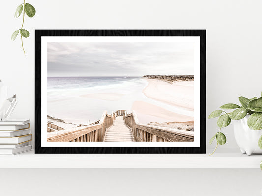 Wooden Staircase to Sand Beach Photograph Glass Framed Wall Art, Ready to Hang Quality Print