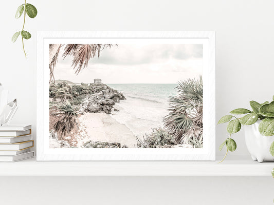 Sea Trees & Rocks near Beach Faded Photograph Glass Framed Wall Art, Ready to Hang Quality Print
