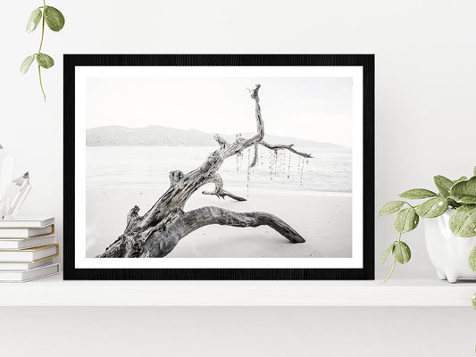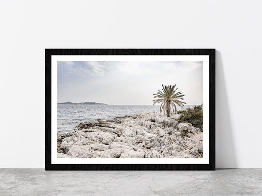 Tree on Rocks near Sea Faded Photograph Glass Framed Wall Art, Ready to Hang Quality Print