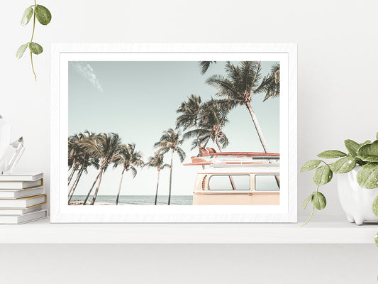 Van & Palm Trees near Beach Photograph Glass Framed Wall Art, Ready to Hang Quality Print