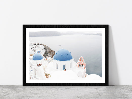 Santorini White Houses & Sea Faded Photograph Glass Framed Wall Art, Ready to Hang Quality Print
