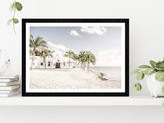 House Palm Trees near Sand Sea Photograph Glass Framed Wall Art, Ready to Hang Quality Print
