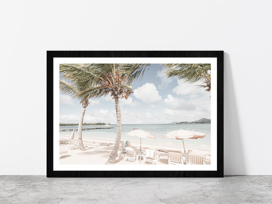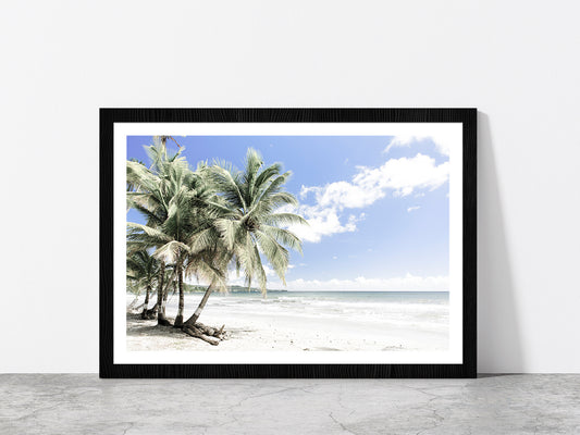 Palm Trees & Sandy Beach View Photograph Glass Framed Wall Art, Ready to Hang Quality Print