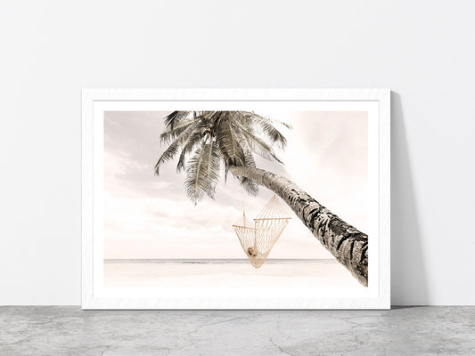 Hammock on Palm Tree near Beach Faded Photograph Glass Framed Wall Art, Ready to Hang Quality Print