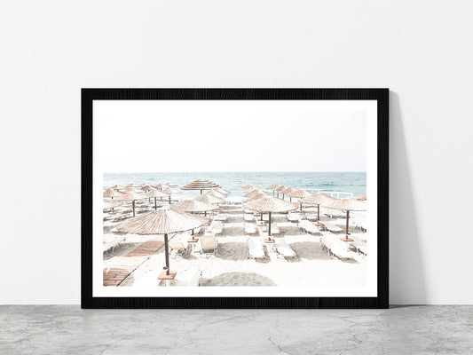 Beach Huts & Chairs near Beach Faded Photograph Glass Framed Wall Art, Ready to Hang Quality Print