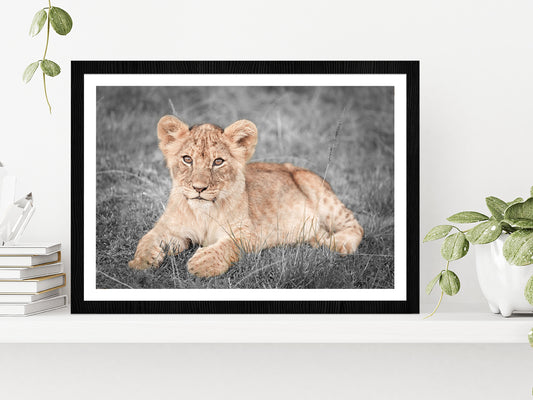 Faded Lion Cub on B&W Grass Field Photograph Glass Framed Wall Art, Ready to Hang Quality Print