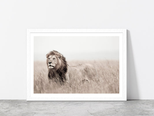 Lion in Grass Field Faded Landscape Photograph Glass Framed Wall Art, Ready to Hang Quality Print