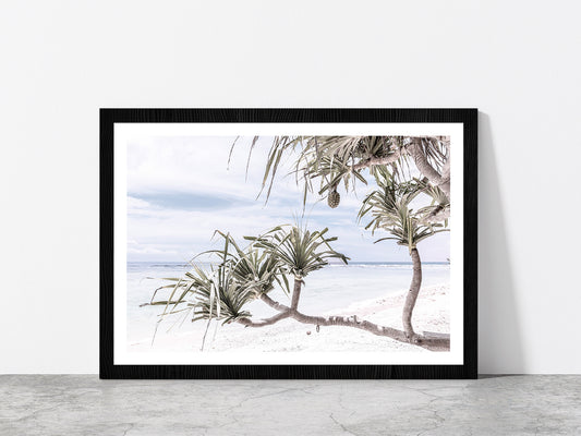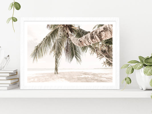 Sandy Seashore & Palm Trees Faded View Photograph Glass Framed Wall Art, Ready to Hang Quality Print