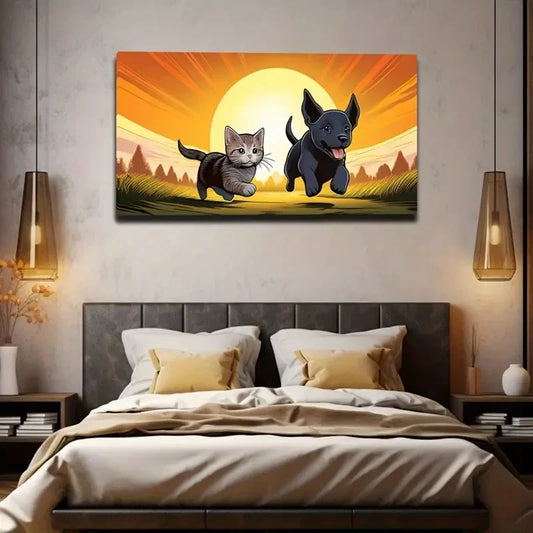 Vibrant Cat & Dog Running Wall Art Canvas Office Home Room Framed 120x60cm