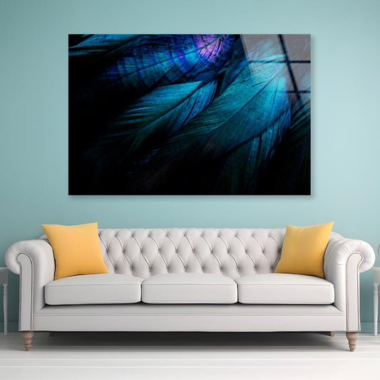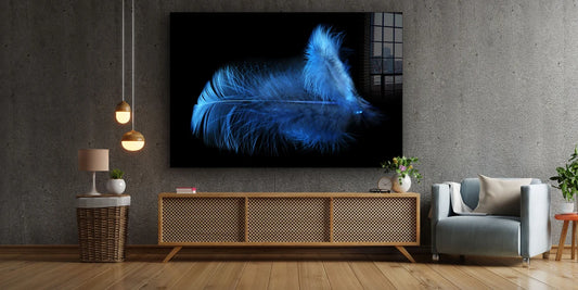Blue Feather on Dark Print Tempered Glass Wall Art 100% Made in Australia Ready to Hang