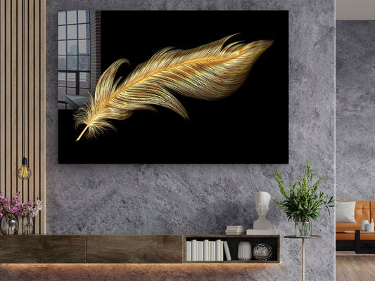 Dark Golden Feather Print Tempered Glass Wall Art 100% Made in Australia Ready to Hang