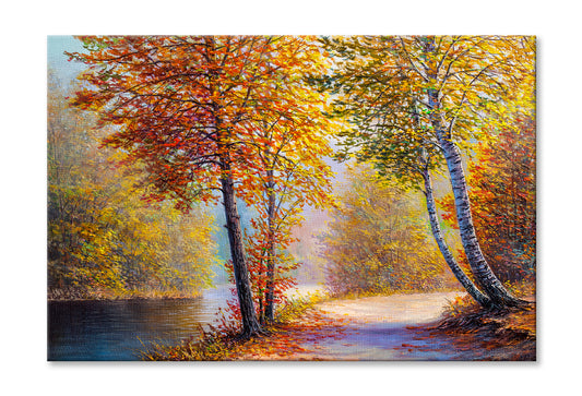 Bright Red Leaves Trees In Autumn Forest & River Oil Painting Wall Art Limited Edition High Quality Print