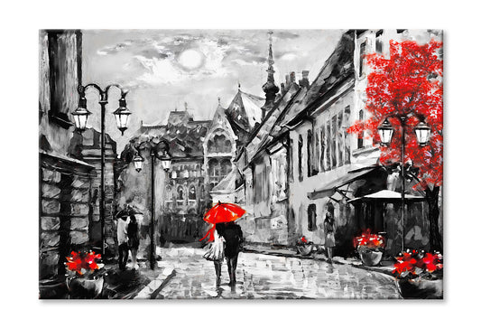 Budapest Street & Couple Under Red Umbrella B&W Painting Wall Art Limited Edition High Quality Print