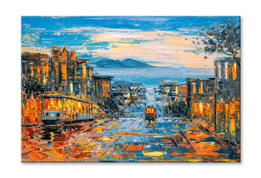 Cable Car San Francisco City & Cloudy Sky Oil Painting Wall Art Limited Edition High Quality Print
