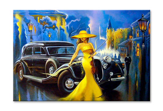 Car and Girl, Old City Oil Painting Wall Art Limited Edition High Quality Print