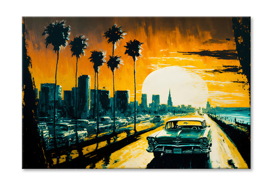 Car in Cityscape & Palm Trees Sunset Sky Oil Painting Wall Art Limited Edition High Quality Print