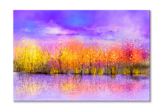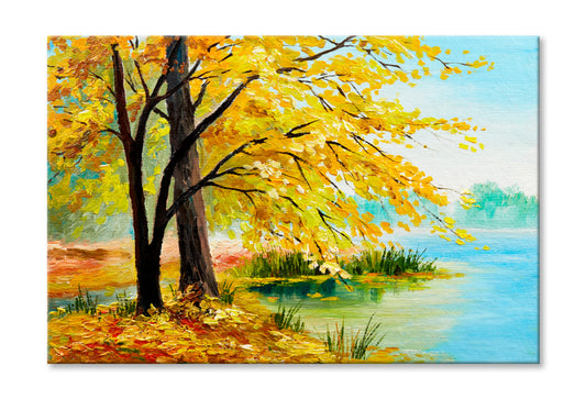 Colorful Autumn Forest, Trees With Yellow, Red Leaf & Lake Oil Painting Wall Art Limited Edition High Quality Print