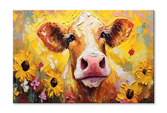 Closeup Cow Face with Sunflowers Oil Painting Wall Art Limited Edition High Quality Print