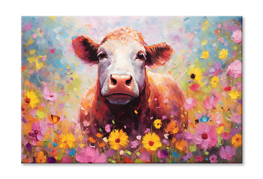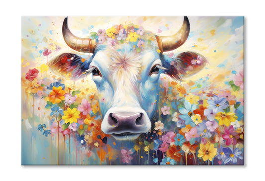 Cow Face in Colorful Blossom Flowers Oil Painting Wall Art Limited Edition High Quality Print