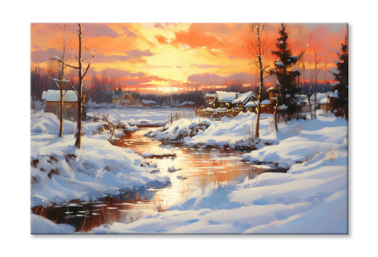 House in Forest Snow Field & Sunset Sky Painting Wall Art Limited Edition High Quality Print