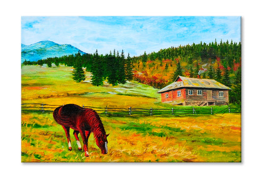 Horse Near The House Mountain Landscape Oil Painting Wall Art Limited Edition High Quality Print