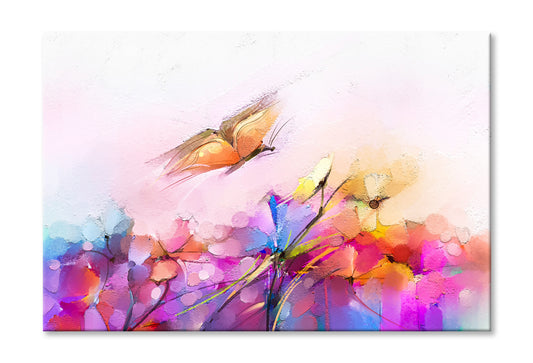 Abstract Butterfly Flying over Spring Flowers Painting Wall Art Limited Edition High Quality Print