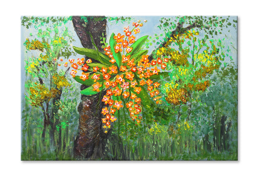 Orange Orchids on Tree Trunk Oil Painting Wall Art Limited Edition High Quality Print