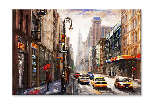 People on New York Street & Yellow Taxi Watercolor Painting Wall Art Limited Edition High Quality Print