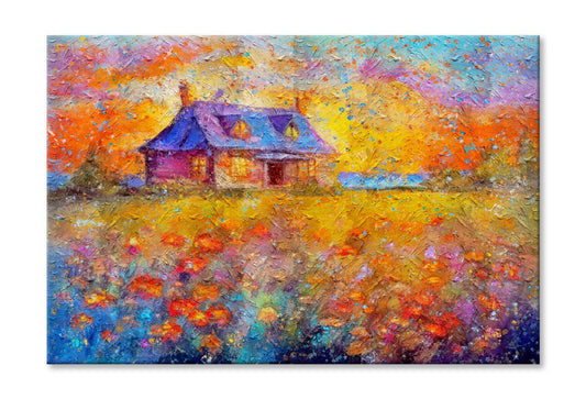 Painting Of Old Rural House On Field Flowers, Beautiful Wildflowers On Beautiful Sunset Wall Art Limited Edition High Quality Print