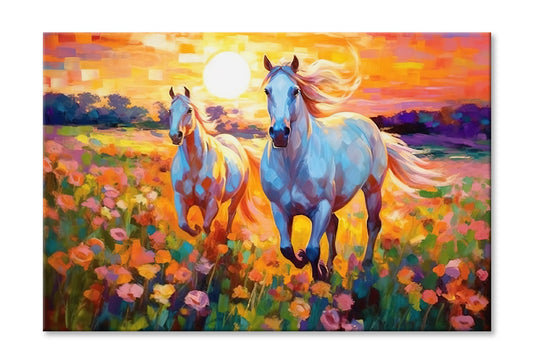 Pair of Horses Running in Colorful Flower Field Painting Wall Art Limited Edition High Quality Print