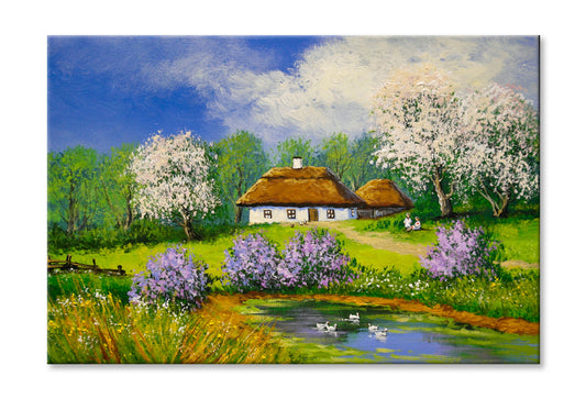 Pond near Houses & Garden Cloudy Sky Oil Painting Wall Art Limited Edition High Quality Print