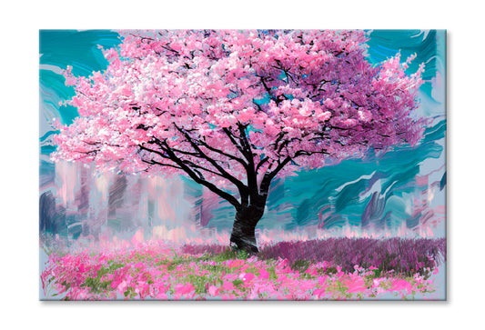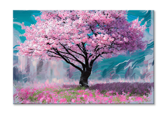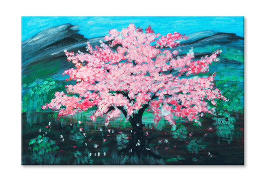 Pink Sakura Cherry Tree in Green Field Painting Wall Art Limited Edition High Quality Print
