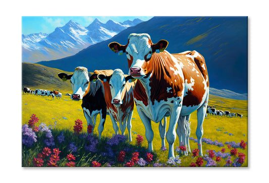 Pleasant Cows & Snow Mountain with Flowers Painting Wall Art Limited Edition High Quality Print