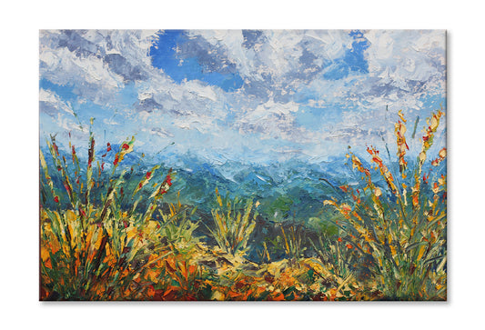Plants on Mountain with Cloudy Sky Watercolor Painting Wall Art Limited Edition High Quality Print