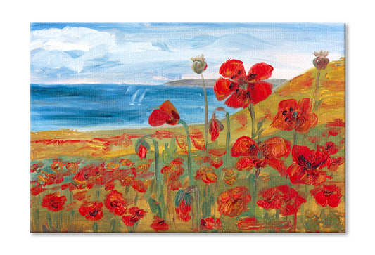 Red Poppies Field near Sea Watercolor Painting Wall Art Limited Edition High Quality Print