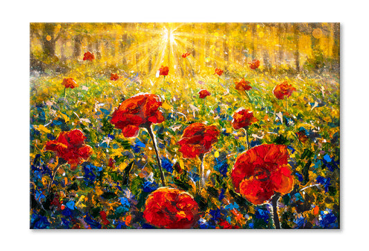 Red Poppies Field, Sun Rays Sunny Flower Field Oil Painting Wall Art Limited Edition High Quality Print