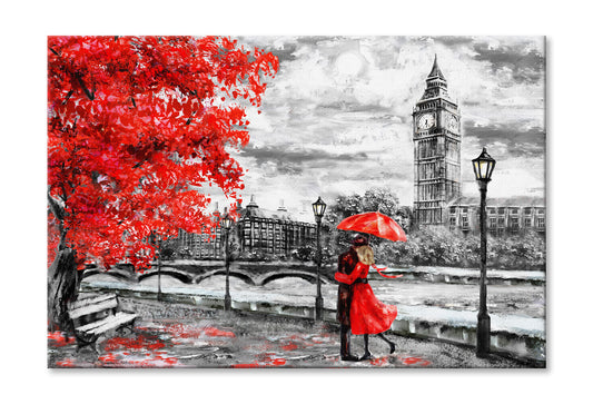 Red Umbrella Couple & Big Ben B&W Oil Painting Wall Art Limited Edition High Quality Print