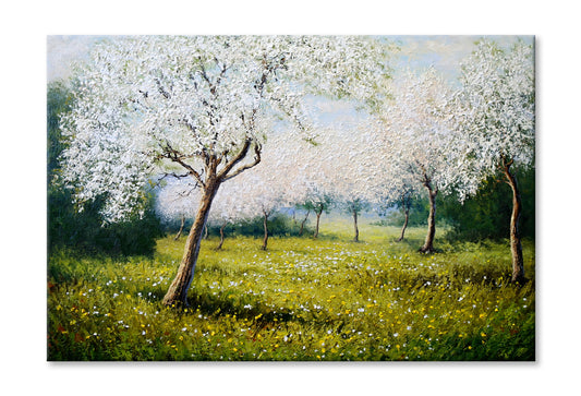 Spring Blossom Tree on Green Grass Field Painting Wall Art Limited Edition High Quality Print