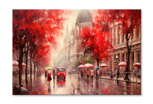 Street View Of Budapest, People Under A Red Umbrella & Tree, Night & Moon Oil Painting Wall Art Limited Edition High Quality Print