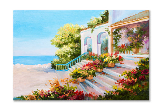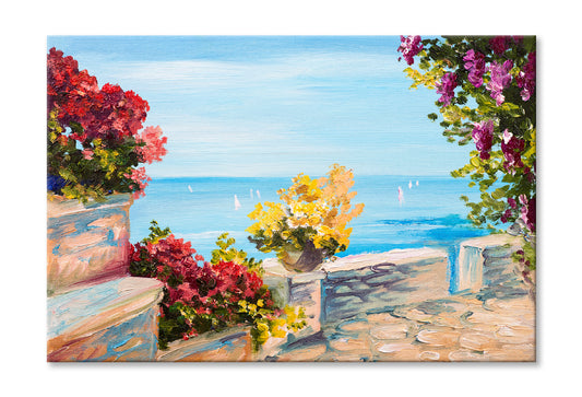 Terrace Near The Sea With Flowers Garden Oil Painting Wall Art Limited Edition High Quality Print