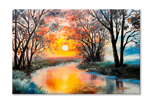 The River In Autumn Forest & Sunset Painting Wall Art Limited Edition High Quality Print