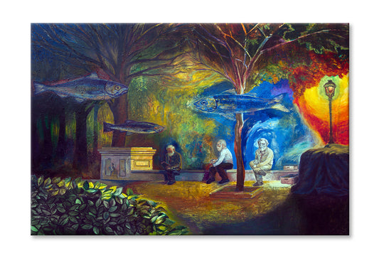 Three Old Men Sitting On A Bench & Fishes Floating On The Above Oil Painting Limited Edition High Quality Print