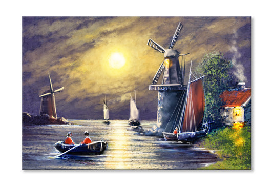 Windmill near Lake & Boats Night Sky Oil Painting Wall Art Limited Edition High Quality Print
