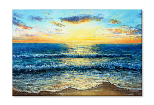 Waves In Sea & Sunset Over The Beach Oil Painting Wall Art Limited Edition High Quality Print