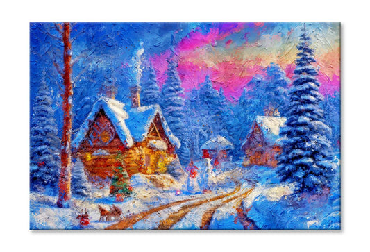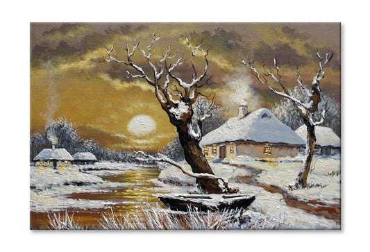 Winter in Village & Trees Sunset Sky Oil Painting Wall Art Limited Edition High Quality Print